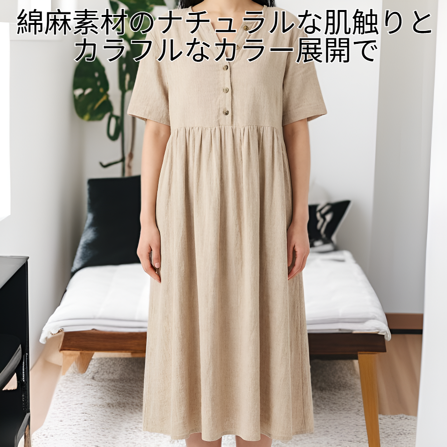 ● 夏らしいカラフルなデザインで、着るだけで気分が明るくなるロングワンピース。綿麻素材で通気性抜群、暑い季節も快適に過ごせます。